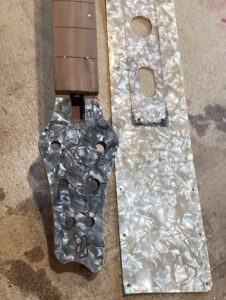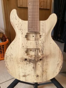 Die Jay Special „Wormhole“ ist mein Beitrag zum Nachhaltigkeitsgedanken. Der Korpus besteht aus Ahornholz von einem Baum, der vor etlichen Jahren noch in Nachbarns Garten stand. Der Baum ist zwar sehr schnell gewachsen, war aber noch immer recht schwer, so dass der Korpus großzügig „gechambert“ wurde. So wird diese ungewöhnlich dicke Gitarre (fast sechs Zentimeter) überraschend leicht.